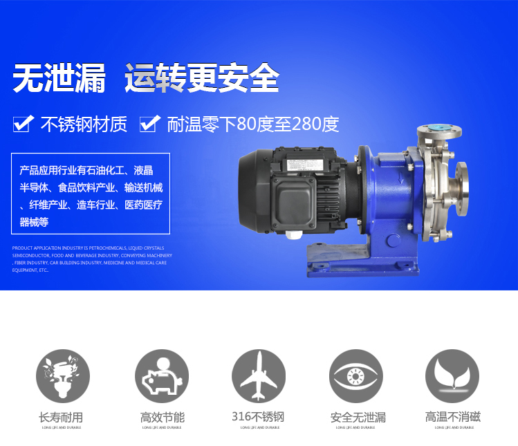 在石油、化工、制藥、電子等眾多領域,越來越多的廠家,對其輸送的介質都要求無泄漏的泵型,不銹鋼磁力泵的過流部件采用不銹鋼(304、316、316L)制成,廣泛應用于石油、化工、制藥、電鍍、環(huán)保、水處理、國防等部門,是輸送易燃、易爆、有毒和貴重液體的理想設備。適用溫度:-40℃~280℃。