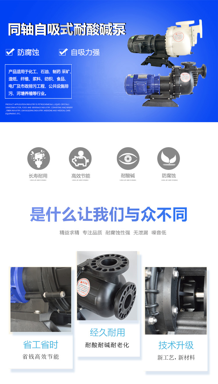 耐酸堿自吸泵采用FRPP,PVDF材料射出成型,耐酸堿、抗腐蝕性強,